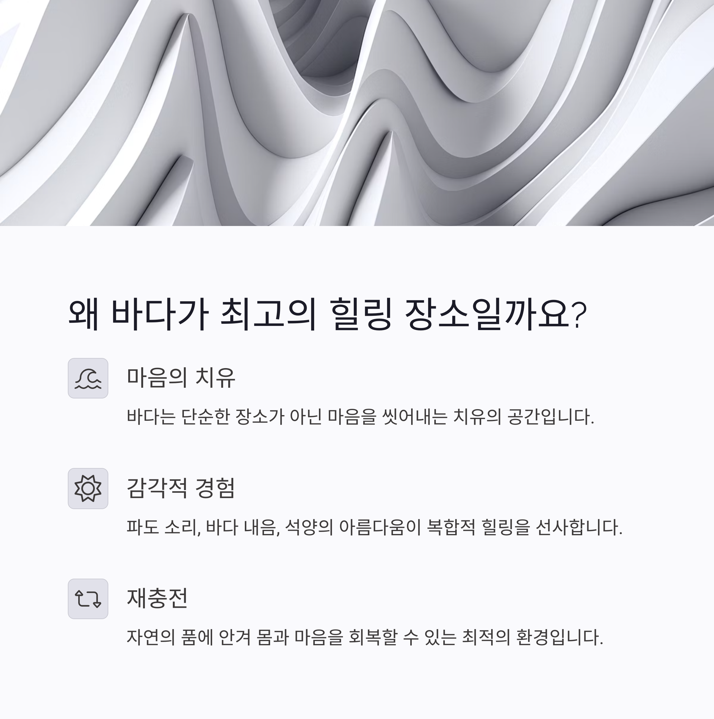 특유의 깊고 푸른 바다가 주는 감각적 치유가 강점입니다.