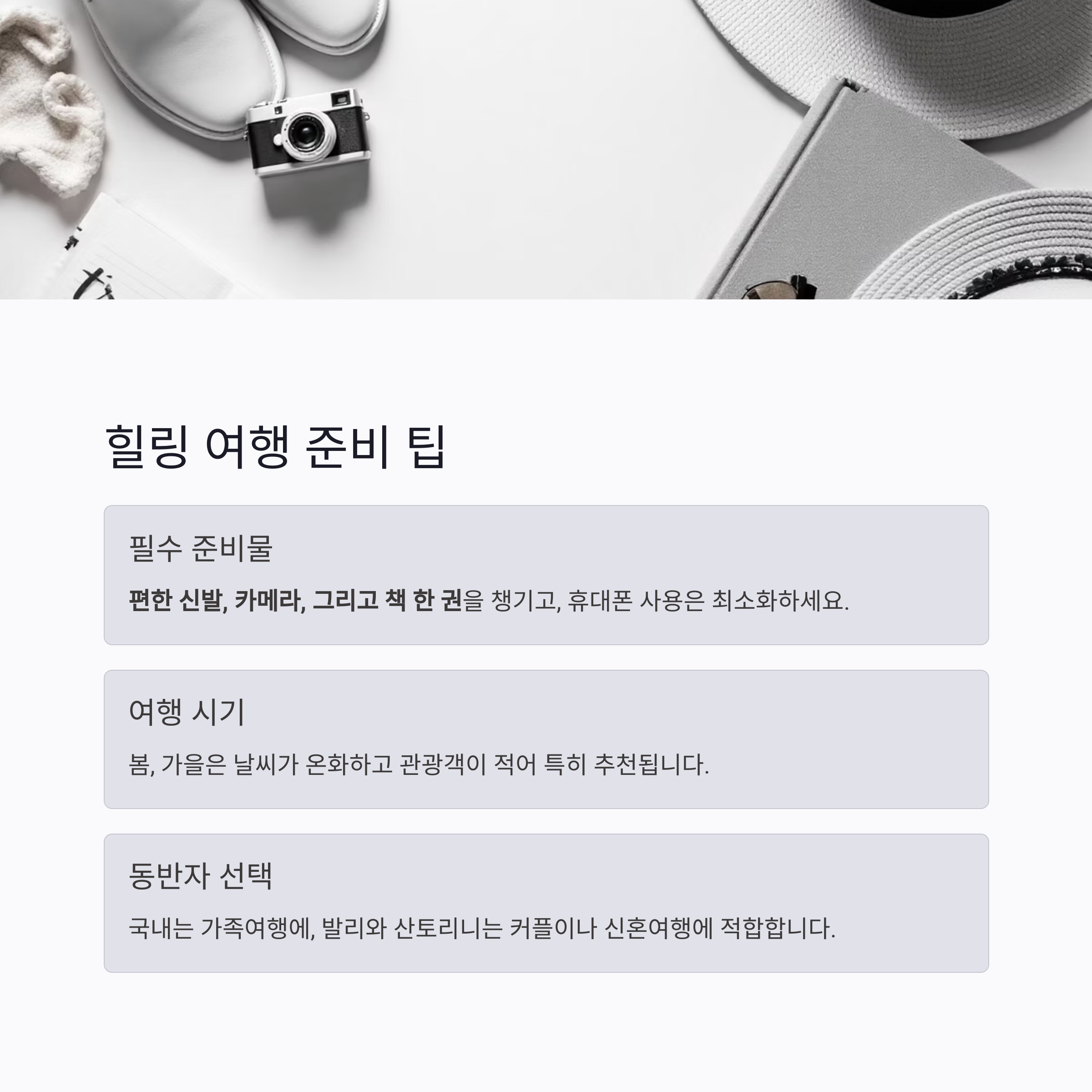 Q: 힐링 여행에 무엇을 챙기면 좋을까요?