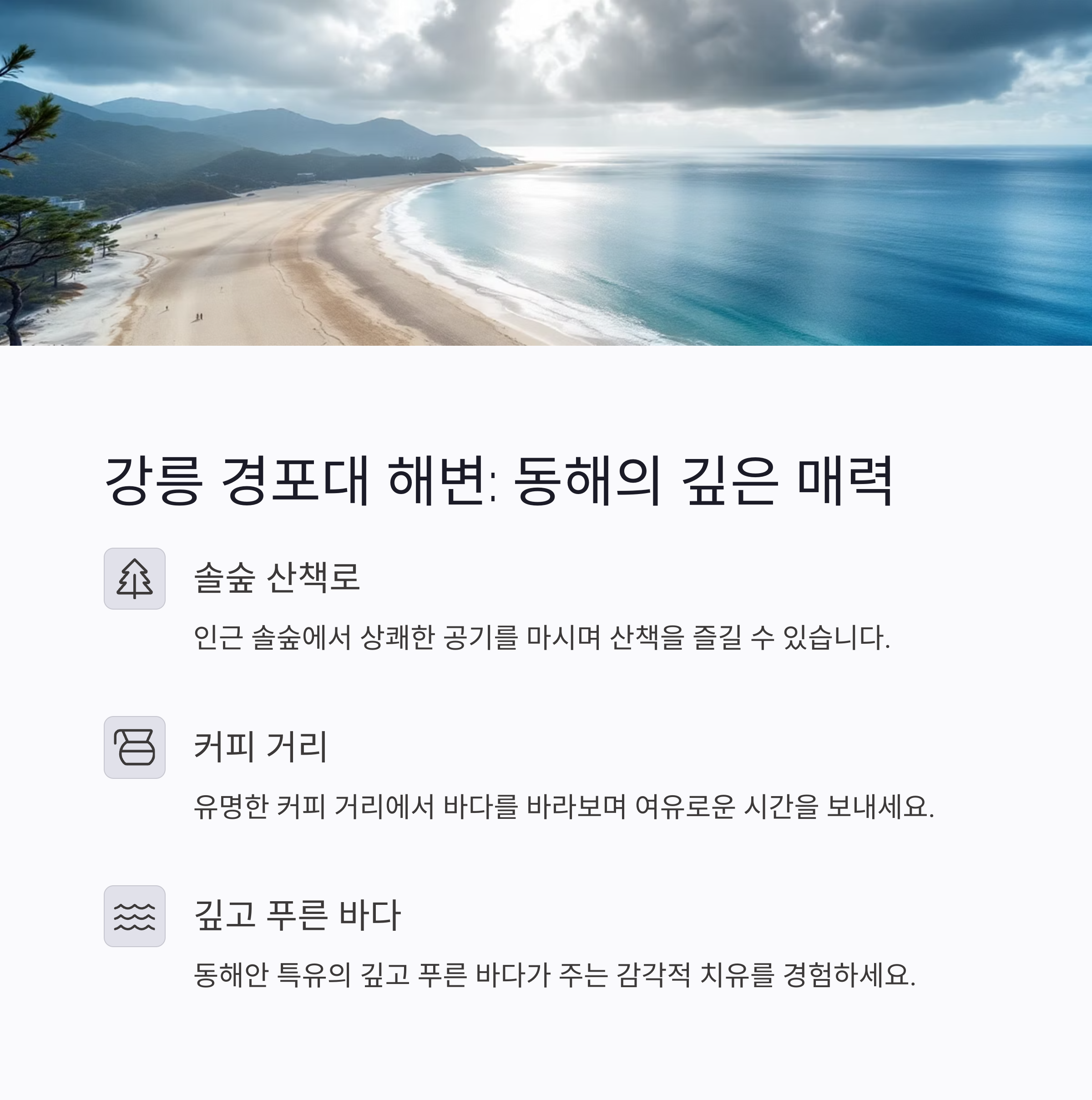 특유의 깊고 푸른 바다가 주는 감각적 치유가 강점입니다.