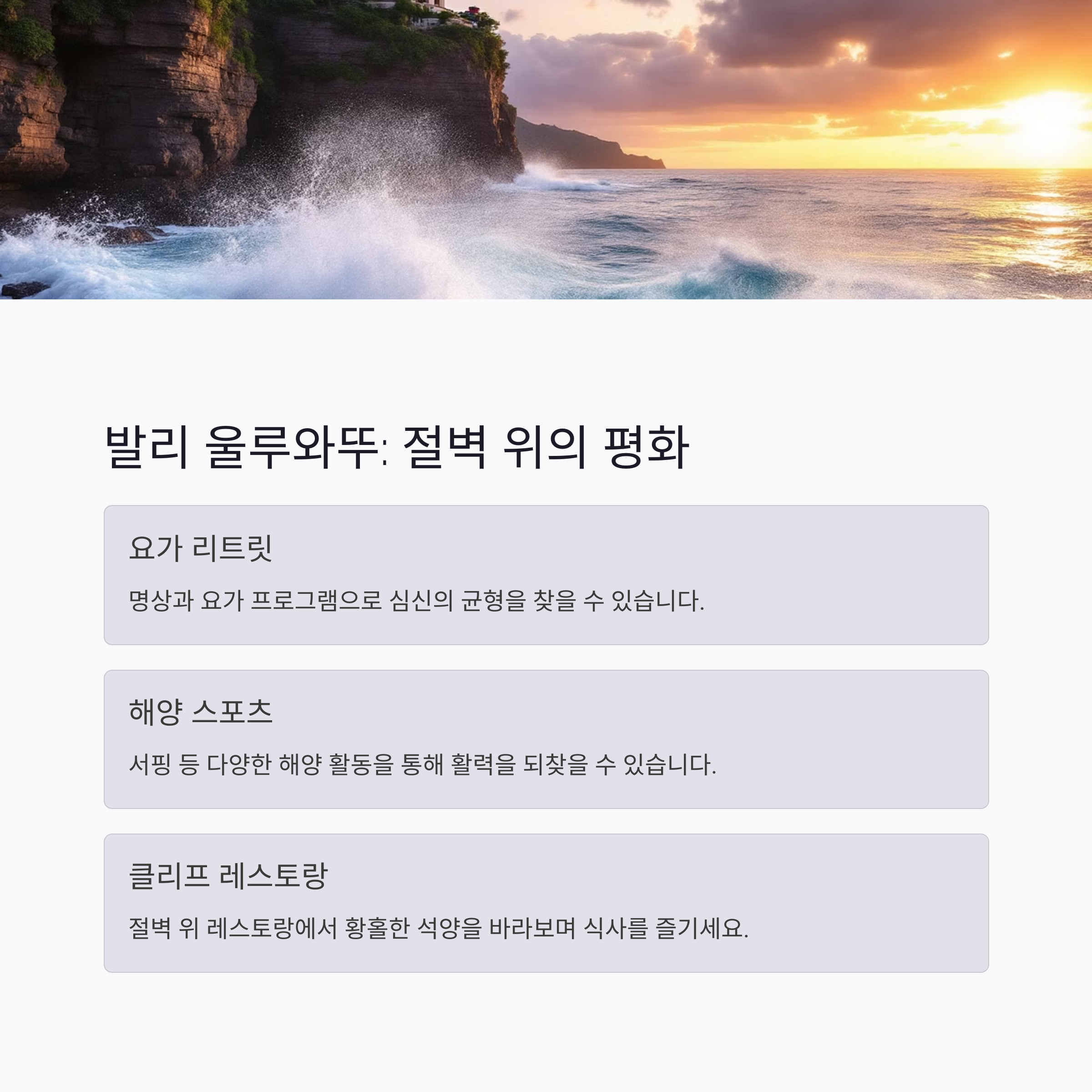 | 발리 울루와뚜 | 절벽, 요가 리트릿 | 명상, 서핑 |