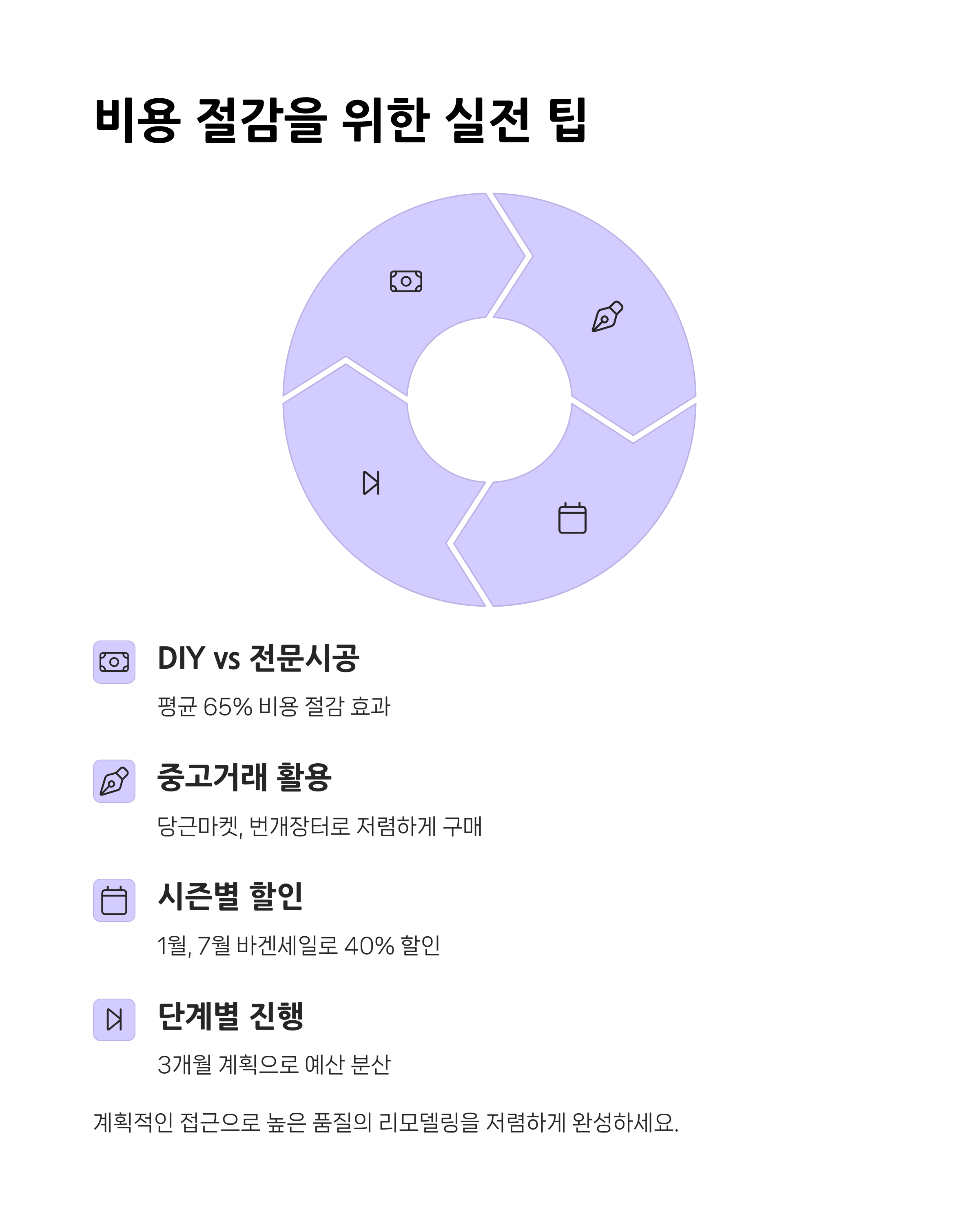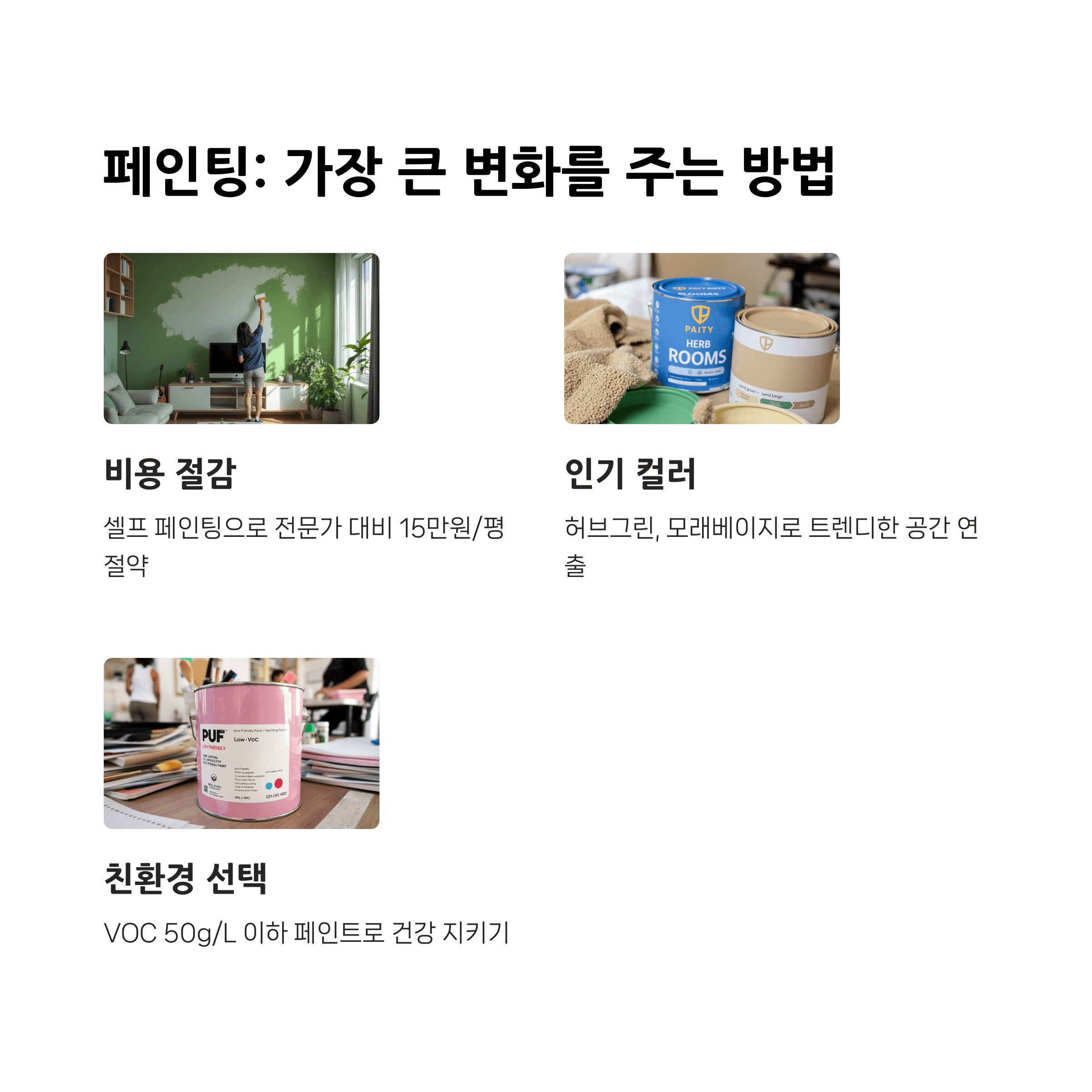 | 셀프 작업으로 비용 절감 | 가구 재배치 팁 공유 | 다양한 조명 종류 활용법 |