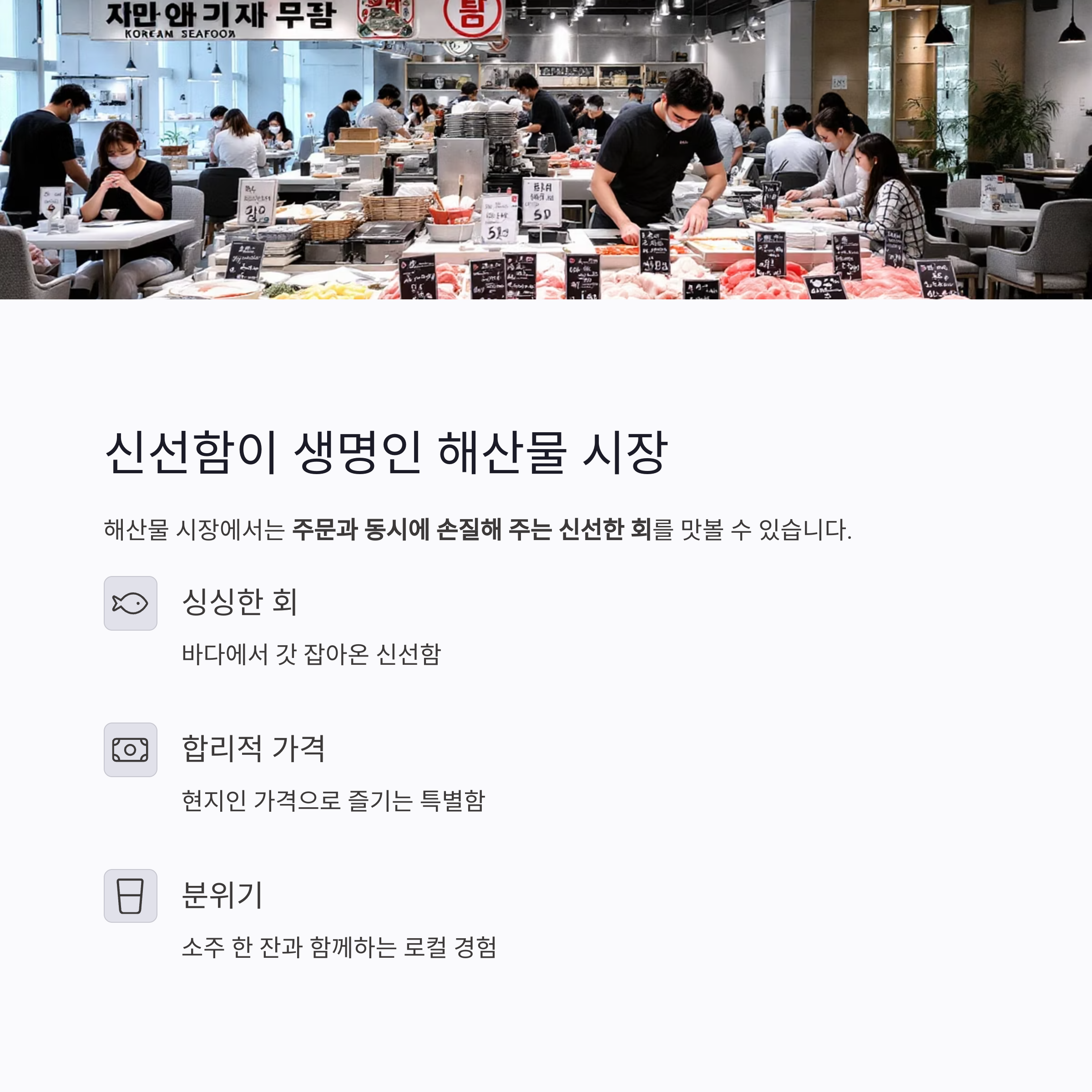 해산물을 좋아하는 사람이라면 반드시 들러야 하는 곳입니다.