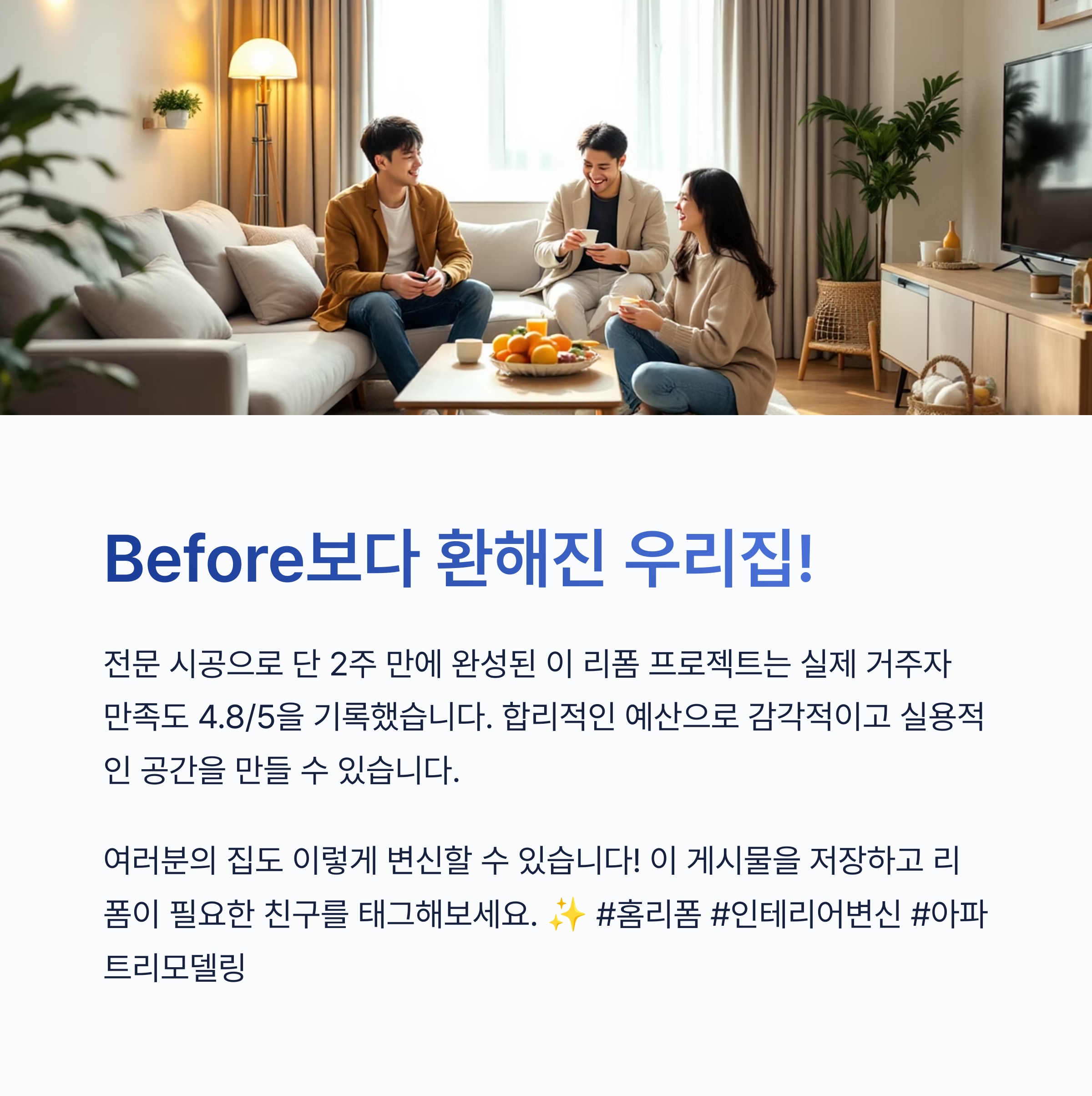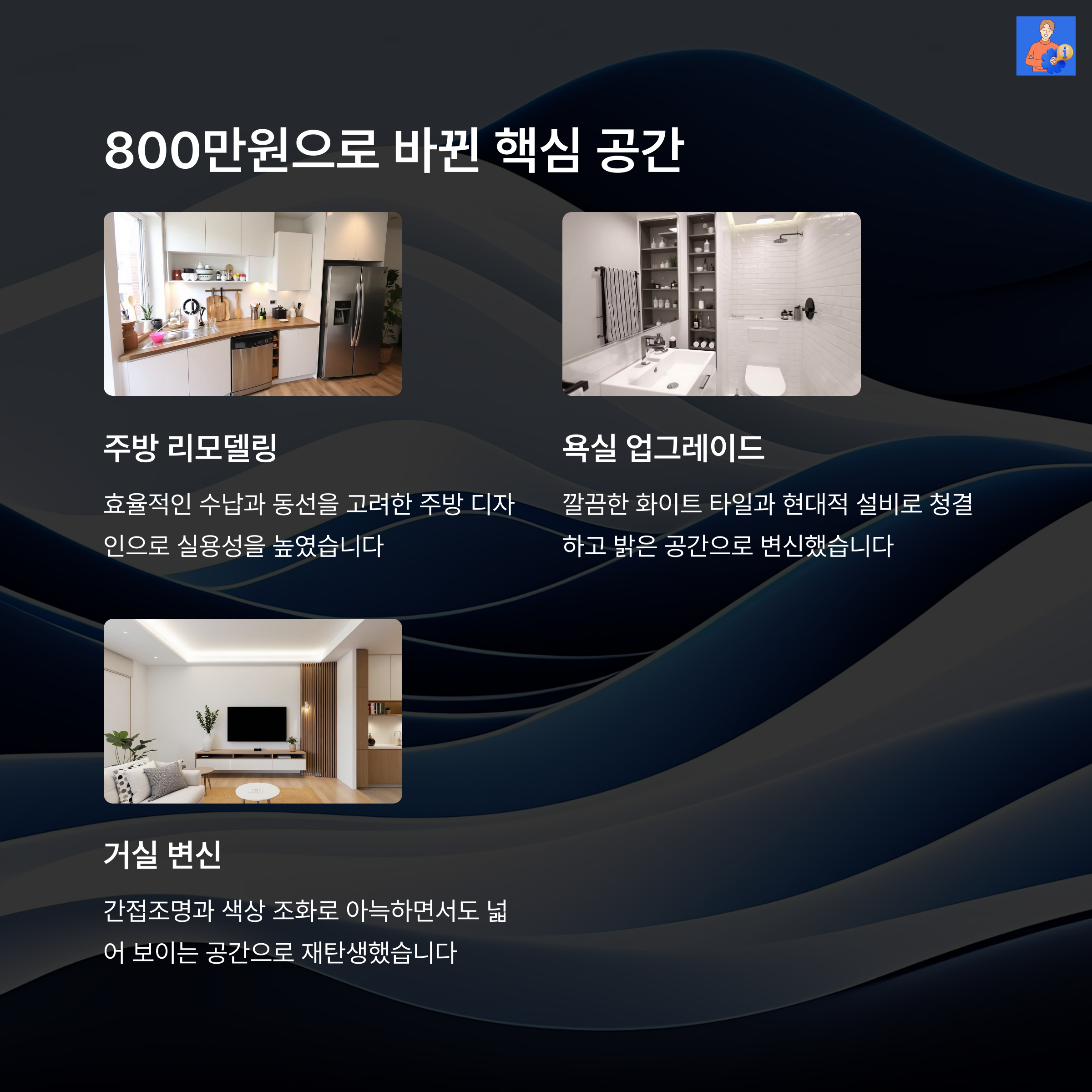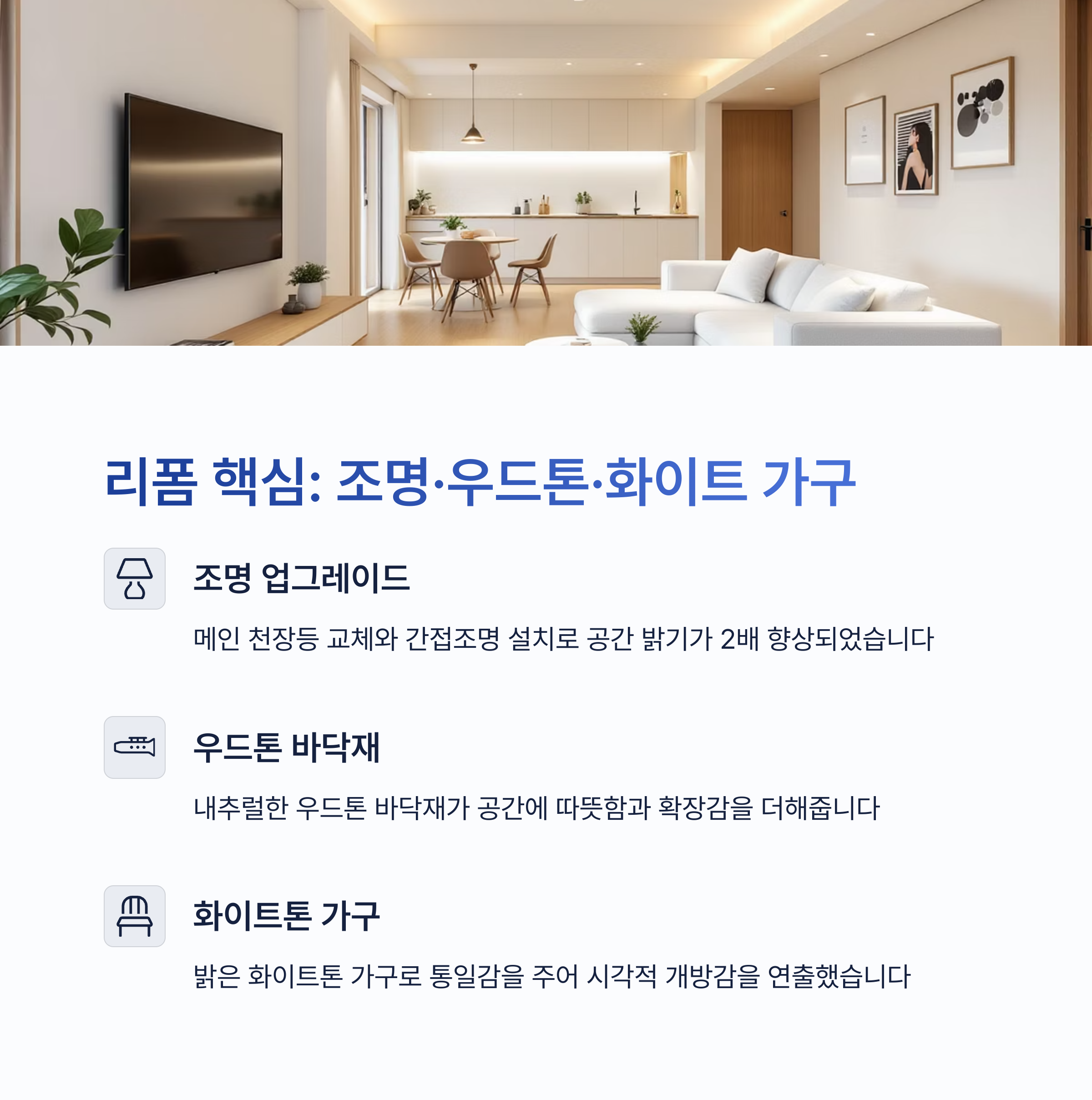 | 핵심 리폼 포인트 | 주방, 욕실, 바닥, 조명 등 핵심 공간 집중 개선 |