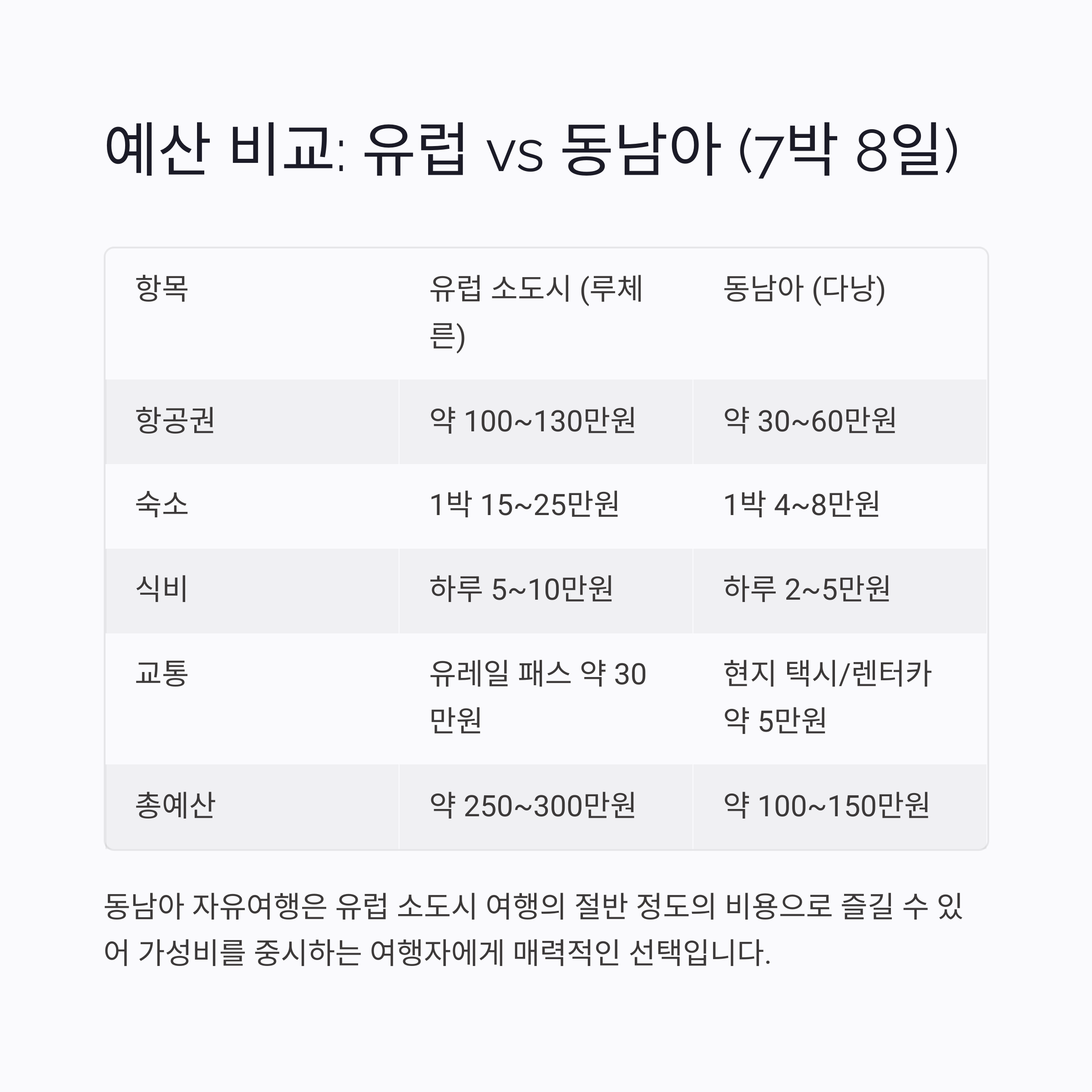 아래 표는 동일한 여행 기간(7박 8일 기준)으로