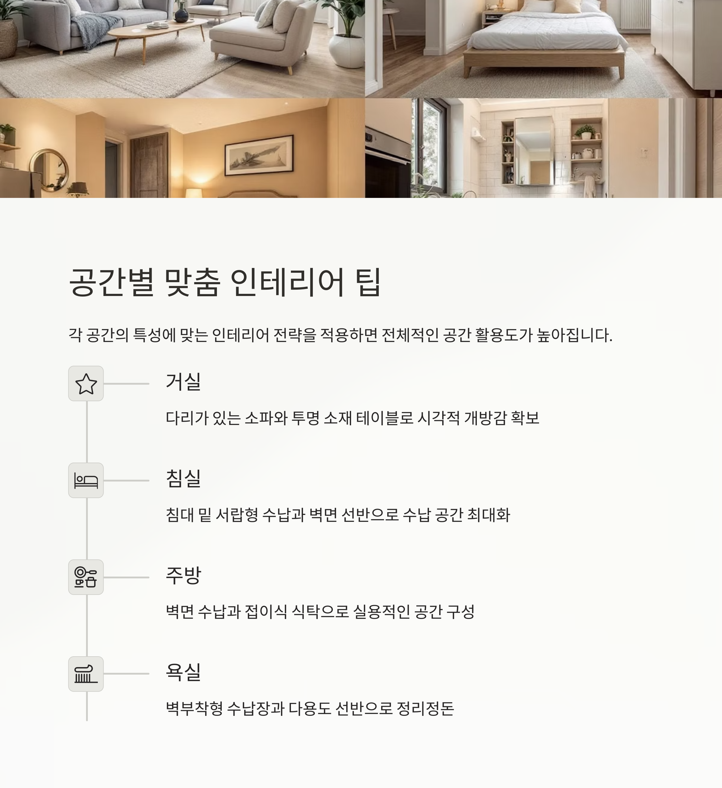 침대 아래 수납, 벽 수납장 등 추천 공간별 수납 가이드 제공 인테리어 스타일별 컬러 조합 팁