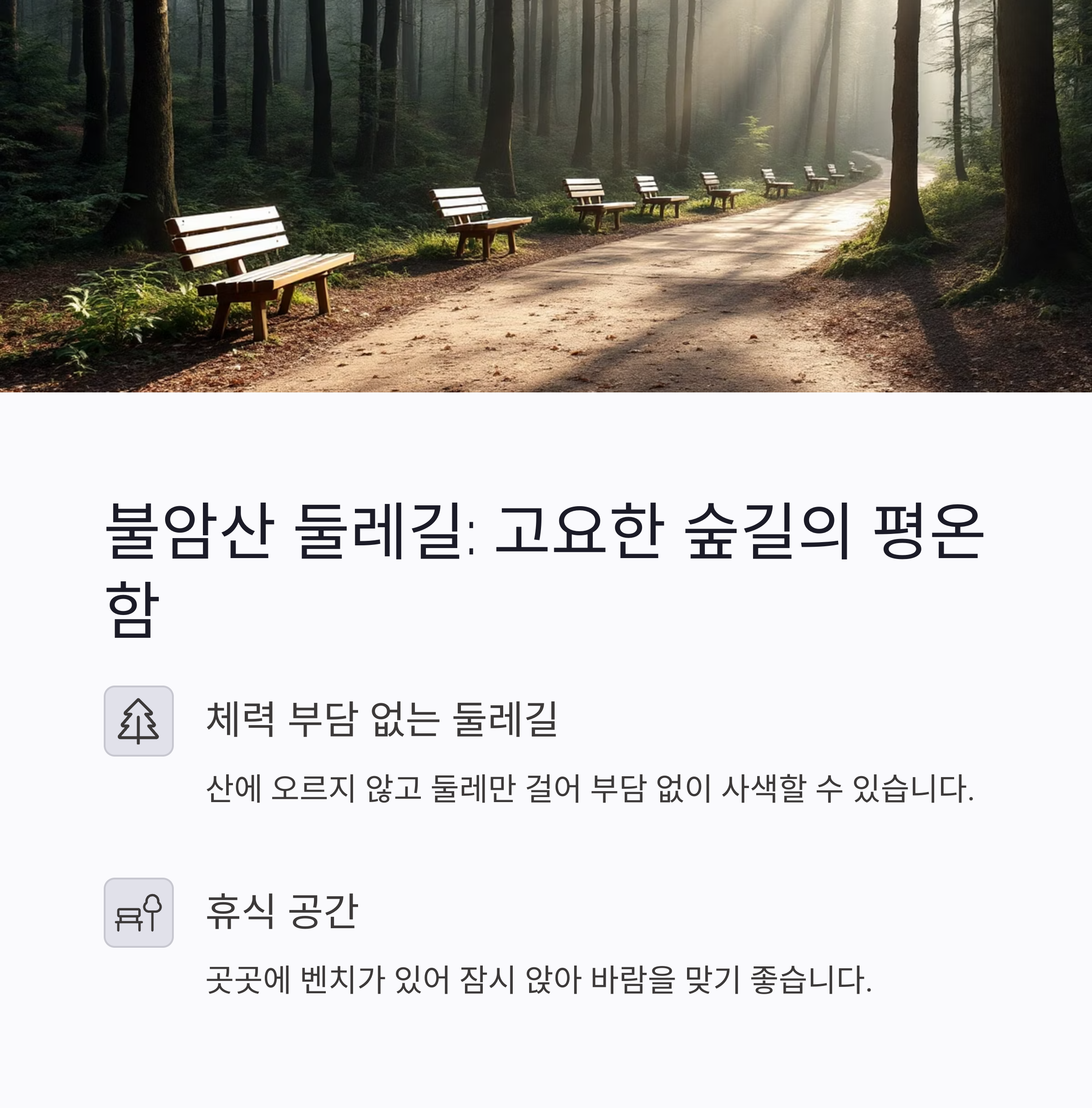 | 불암산 둘레길 | 조용한 숲길, 벤치 | 봄, 가을 |