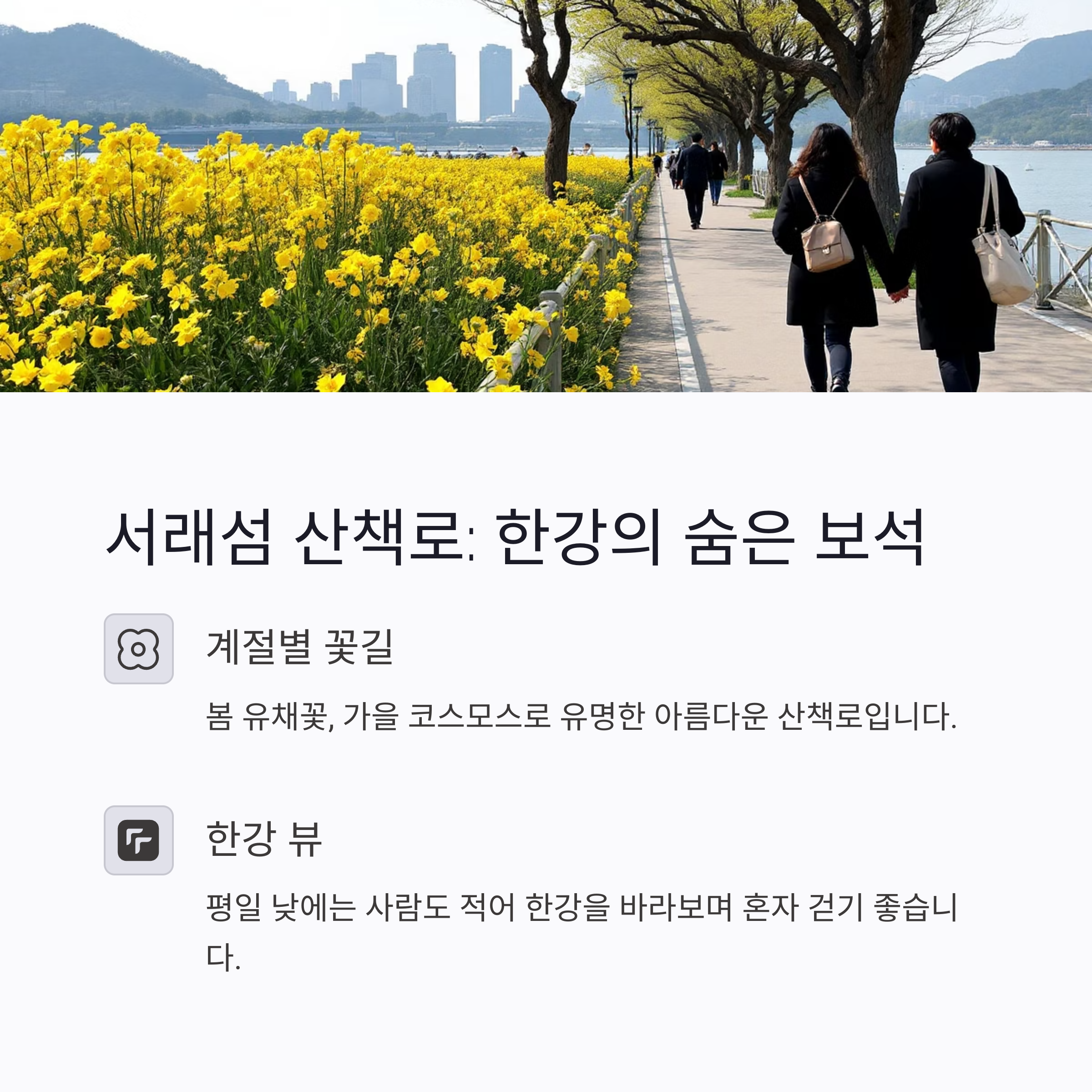 | 서래섬 산책로 | 꽃길, 한강 뷰 | 봄, 가을 |