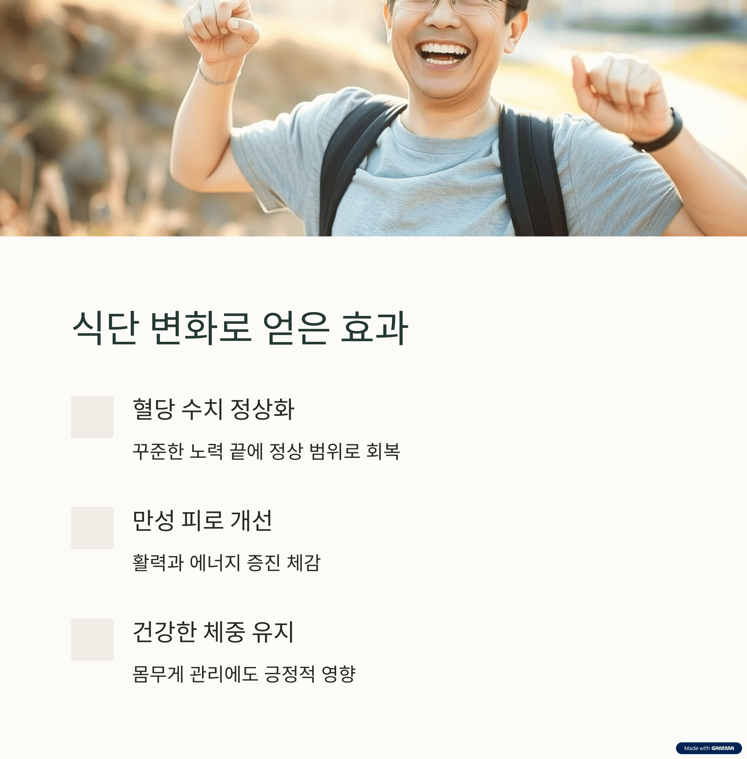 처음에는 식단을 바꾸는 것이 쉽지 않았지만, 꾸준히 노력한 결과 놀라운 변화가 찾아왔습니다. 가장 먼저 몸이 가벼워지는 것을 느꼈고, 만성 피로감도 점차 사라졌습니다. 그리고 가장 중요한 변화는 바로 ‘혈당 수치’였습니다. 식단 관리 전 불안정한 수치를 보이던 혈당이 정상 범위로 돌아온 것을 확인했을 때, 정말 큰 보람을 느꼈습니다.